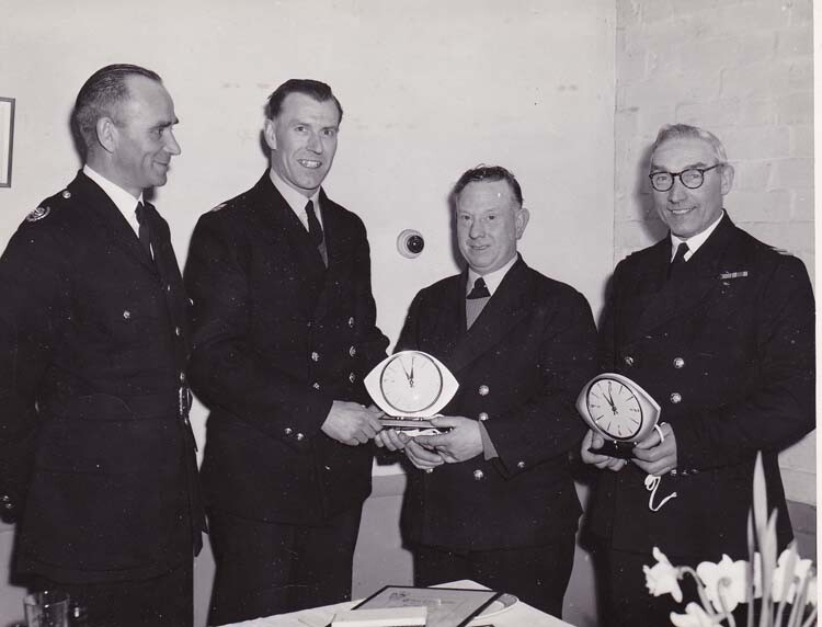 A presentation in March 1962 to Sub-Officer Alec Lingley ( glasses) and Fireman B Race. On extreme left Division Commander V Squirrel and, making the presentation, the new Sudbury Station Officer HG (Bert) Sermons.