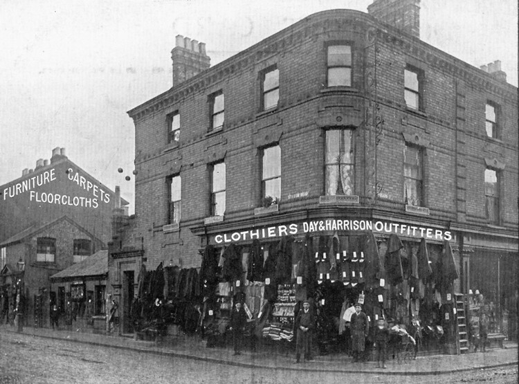 Day and Harrison, outfitters, at No 1 Friars Street c1900. This fine late Victorian building with its intricate brick detailing still survives intact today. The single storey building to the left of the shop became the cafe"Sticky Annie's" in the 1950s and 60s