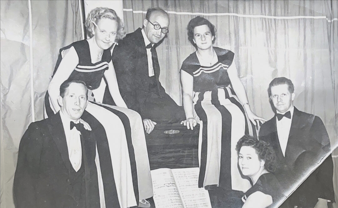 The Patchwork Players were a small group of entertainers who performed in the Sudbury Area in the postwar years. Right to Left Leonard Wickerson, unknown, Mr Offord, Phyllis Wiffen, Mr Wiffen, pianist also unknown.